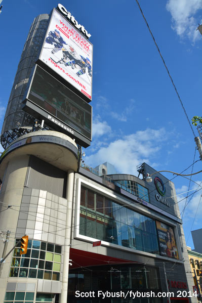 Way up above First Canadian Place, there’s the CN Tower, of course, all lit up at night (we’ll see more of that in the next installment) – and downtown at Dundas Square, across the street from the Eaton Centre, we catch an outside view of the new (2009) home of Rogers’ local Toronto TV stations, CITY-TV (Channel 57) and the OMNI multilingual duo, OMNI 1 (CFMT-TV 47) and OMNI 2 (CJMT-TV 44). CFMT itself used to be a highway landmark, with studios at 545 Lakeshore Drive West alongside the Gardiner Expressway, the QEW’s continuation into Toronto; CITY, for its part, spent two memorable decades in another historic building at 299 Queen Street West, the structure that became known as the “ChumCity Building.”