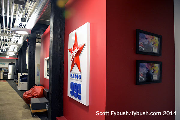 We arrived at 250 Richmond West just a few weeks after CHUM got some new company down the hall. Its original FM neighbor around the corner was urban station CFXJ (93.5 Flow FM), but when Bell bought out Astral Media it spun off its own CFXJ and Astral’s CHBM (Boom 97.3) and instead kept Astral’s CKFM (Virgin Radio 99.9) and CFRB (Newstalk 1010). CFXJ moved in with Boom uptown at another historic radio site, 2 St. Clair Ave. West, while CKFM and CFRB left St. Clair after more than 50 years to join CHUM down here. Virgin’s production and on-air booths now sit in the former Flow space just down the hall from erstwhile competitor CHUM-FM.