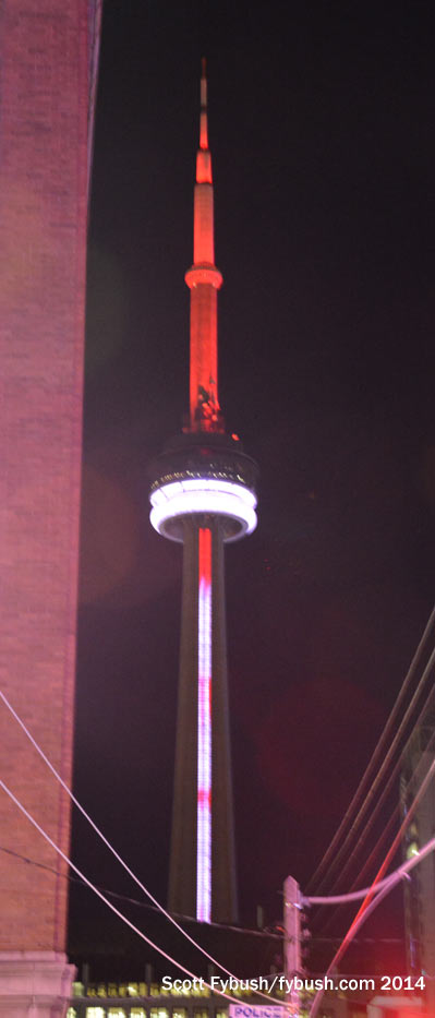Heading into Toronto, we get some quick outside views of some broadcast landmarks, new and old: up above, there’s an updated view of the top of First Canadian Place (aka “Bank of Montreal Building”), which we’d seen in detail back in 2006.