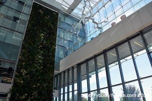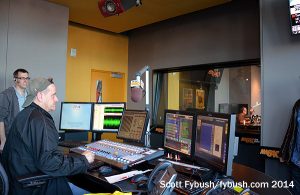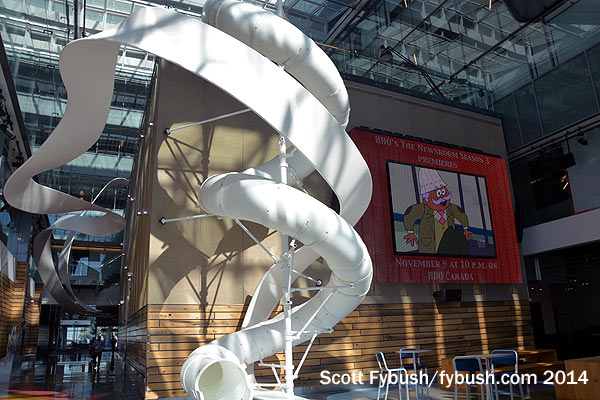 Visitors enter from a lobby adorned with a cylindrical display of all of Corus’ many radio, TV and interactive properties. After a few minutes figuring out which of those stations we’d visited (not enough!) we head inside and down a five-story, wood-lined corridor that leads past two TV studios and control rooms to the glass-walled atrium that looks out to the lake. Yes,that’s an indoor slide above at left, leading down to the atrium from conference areas built atop the TV studios in the middle. No, we didn’t get to try it. Yes, we’d love to go back and fix that…