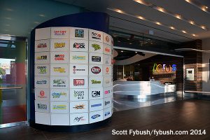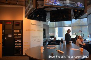 We were here primarily to see the radio stations, which line the outside part of the first floor on the west side of the building. A glass-enclosed rack room greets visitors heading in this way, leading to an L-shaped corridor that’s home to rocker CILQ (Q107) and “Talk 640” (CFMJ). Q107 gets the corner facing the lobby, while AM 640 gets the front wall of the building, starting with a control room that looks through the spacious main talk studio over to two small booths that lead off the corner newsroom, which is decorated with wallpaper featuring famous quotes from newspeople through the years.