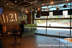 Around the west side of the building, there’s another TV studio adjacent to the very unusual space occupied by CFNY (102.1 the Edge). If this studio looks bigger than most, there’s a good reason: the “studio” itself sits on a platform that overlooks a much larger space where bands can come in and perform. If it’s a nice day (as this warm September day was), the glass wall of the studio can be raised to open the whole thing up to the harborfront park outside. How cool is that?