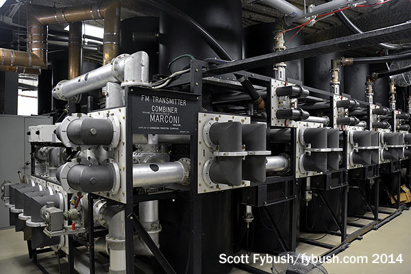 The transmitters of the CN Tower fill most of two small floors in the main pod about 1100 feet above ground, above the main public observation deck and restaurant. TV takes up most of the lower (fifth) level, including a big room shared by the CBC’s CBLT and CBLFT (and their original FM sister, CBL-FM 94.1) and TVOntario’s CICA. Up above them is the FM facility, which was originally designed to house charter commercial tenants CHFI (98.1), CKFM (99.9), CHIN-FM (100.7) and CHUM-FM (104.5) in neat rows adjacent to the big Marconi combiner that the stations all owned together under the aegis of “Master FM, Limited.” (You can read more about how that situation came to be over at the Canadian Communications Foundation website.)