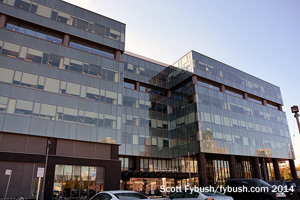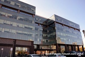 In the 1970s, the CN Tower was the first tentative step toward revitalizing what had been a barren industrial area along the lakeshore west of downtown; four decades later, Corus is trying to do its part to revitalize the lakefront with its Corus Quay development at the foot of Jarvis Street on the east side of downtown. This building opened in 2010 (you can read more about it from Corus here), but still looked brand-new when we got our tour four years later.