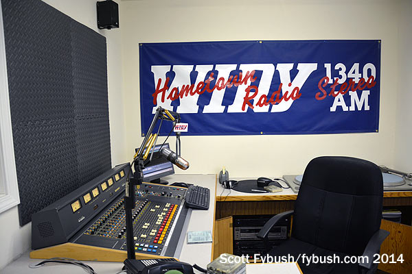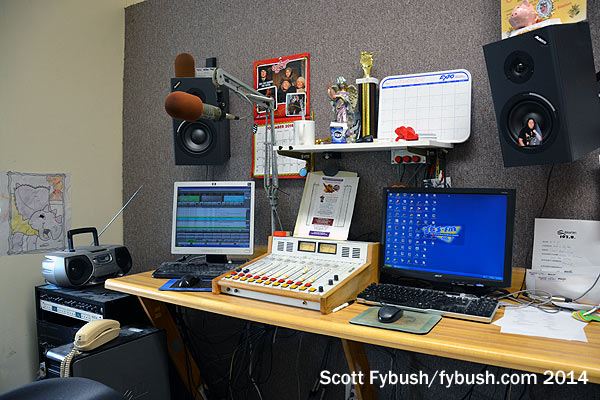 Yes, it’s a Saturday morning, but the door’s open at WIRY as the classic country show plays, and so we stop in to see how the old gear has moved into a new home. The main studio is still lined with vinyl, with a nice window view looking into the front hallway on one side and the newsroom on the other. (Check out the RCA ribbon mike that made the move and is still the main on-air mike!)