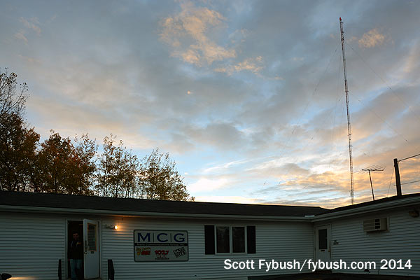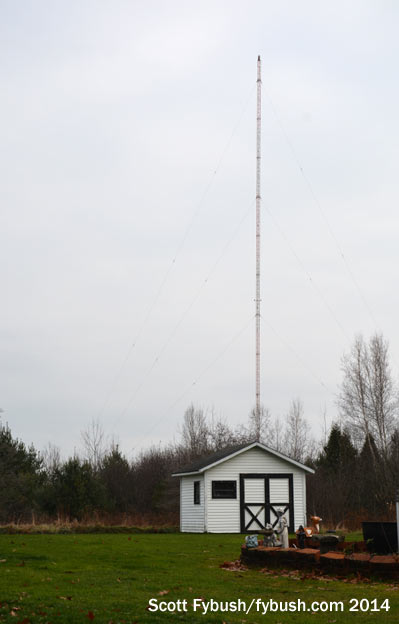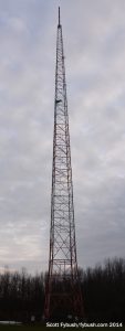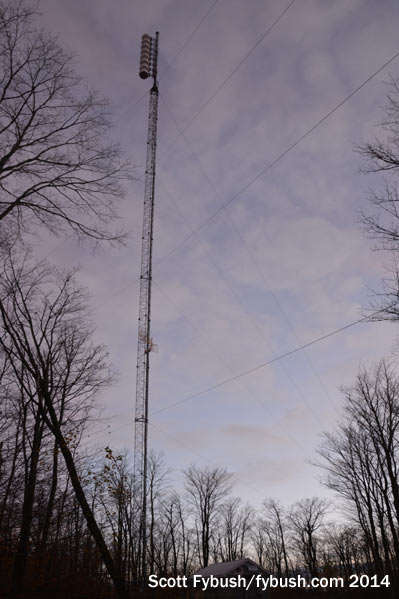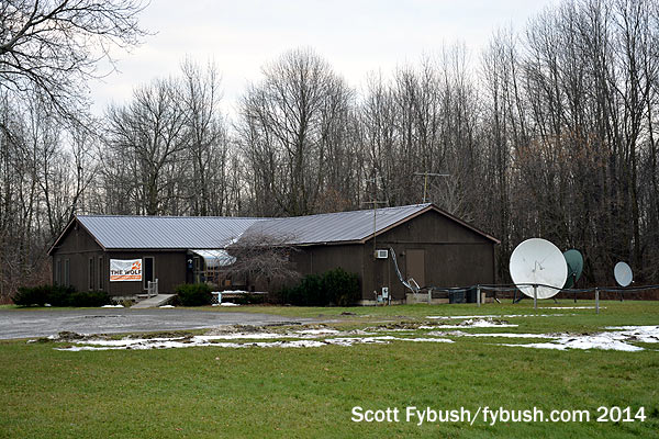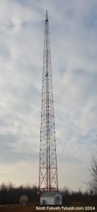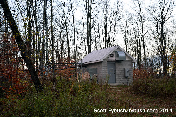 With daylight waning, let’s go get a quick look at the FM tower site, shall we? On a hill off Teboville Road, south of the studios and AM site, we find the small block building that holds a pair of Energy-Onix boxes that pump 94.7 and 96.5 over the North country. That’s a directional SWR antenna at the top of the tower, fed by a combiner down in the building, with an STL hop pointing up to the 102.7 translator site, too.