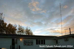 The three stations share a low-slung building at the WICY transmitter site on Porter Road, just south of US 11 on a hill east of downtown Malone. Walk in, as we did right around sunset, and you’ll find offices on your left and studios down a long hallway to your right. First up is the studio of WICY, which now simulcasts its oldies format on an FM translator, W274BI (102.7). The translator is located on a hill west of Malone at a site shared with WSLO (90.9 Malone), the local outlet of North Country Public Radio, and we didn’t get there on this trip.