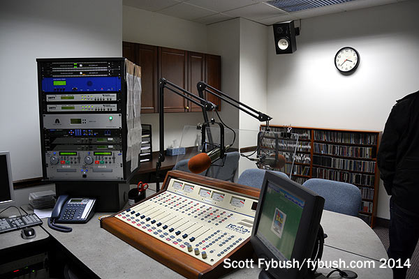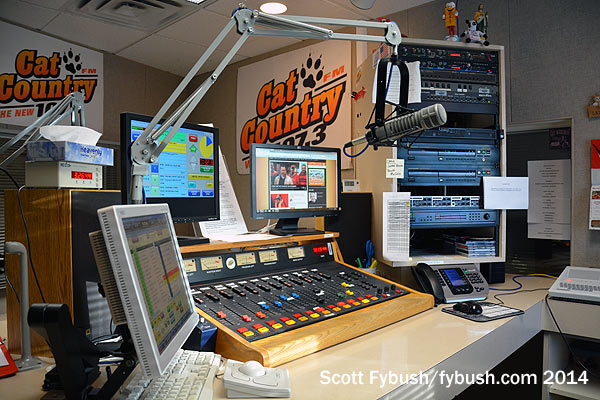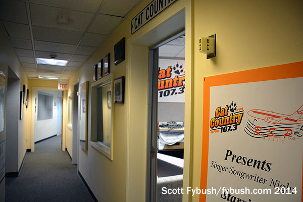 The studios here are all lined up along a curving corridor: WPUR is “Cat Country 107.3,” anchoring one end of the complex next door to WENJ, “ESPN 97.3,” the one Townsquare signal that’s a little too far out for us to visit this time.