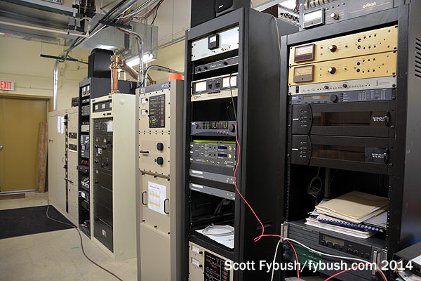 The transmitters are in the back room, and they’re almost all BE – that’s the FM main at far left, the Harris FM aux next to that, and the main and aux BE units for AM 1470 in the foreground.