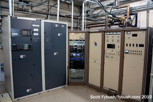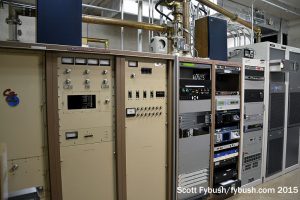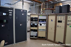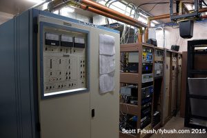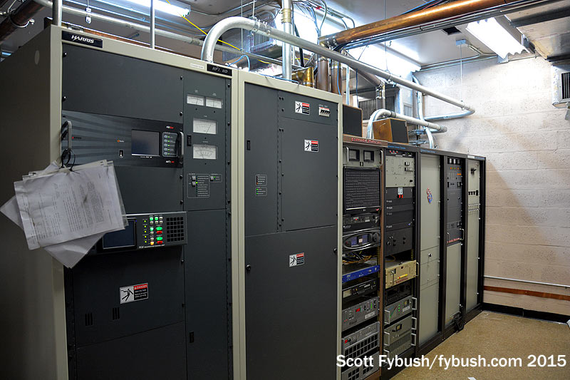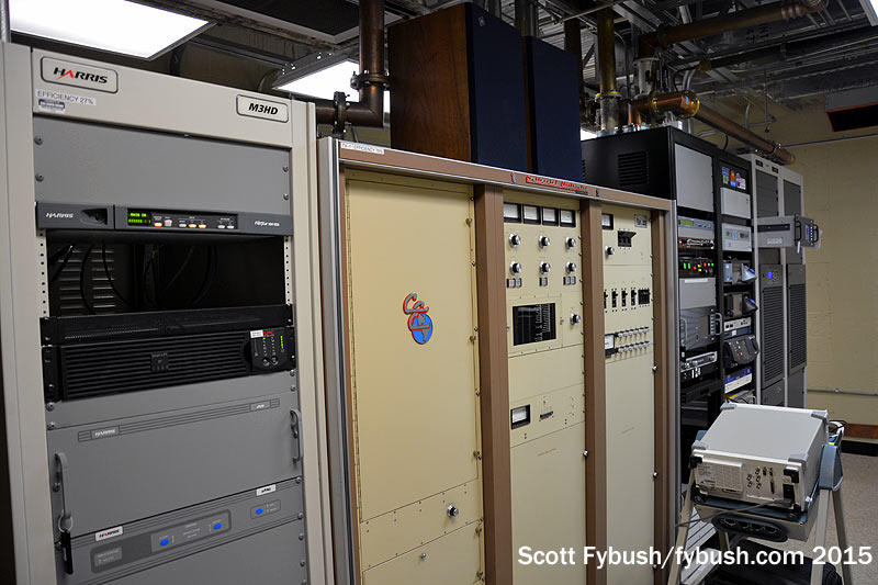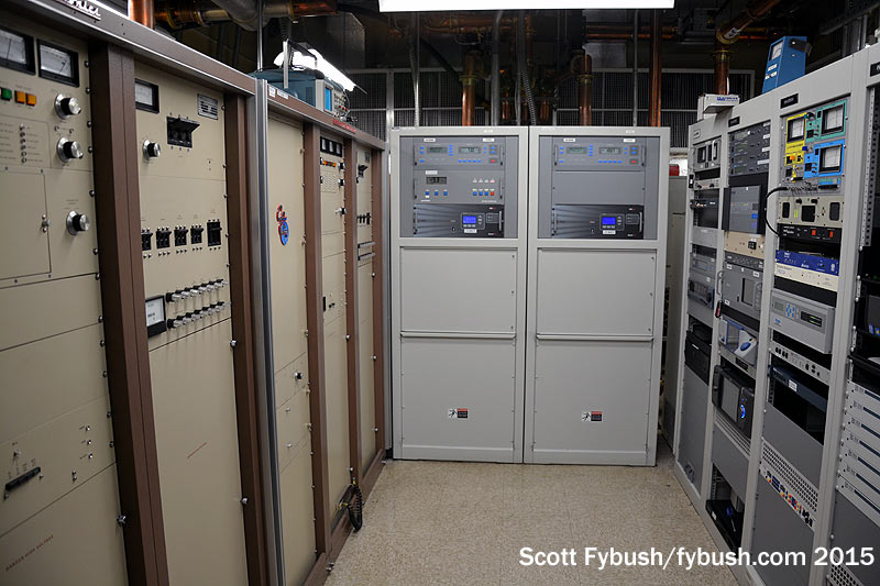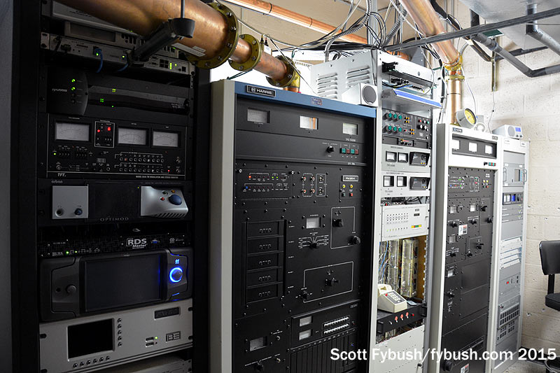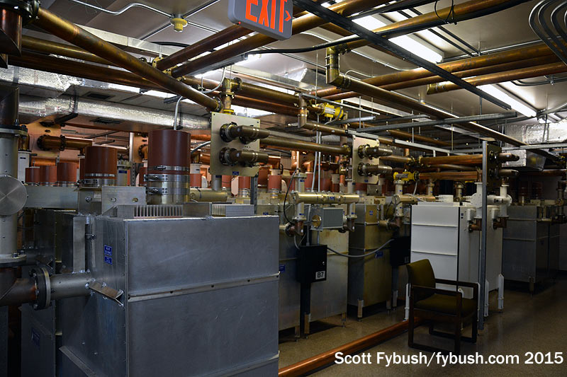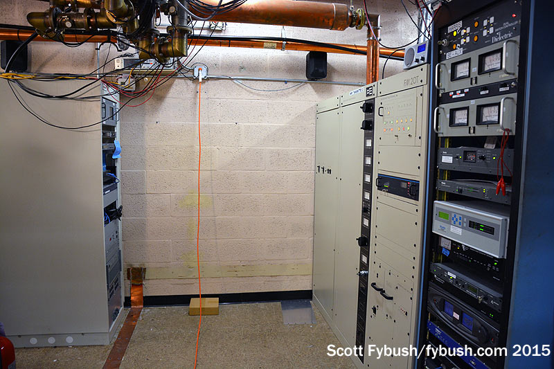 And we conclude back down the hall at Lincoln Financial’s WMXJ (102.7), which has its all-Harris transmitter lineup in a room with an odd intersection of transmission line and equipment rack. The rack rolls out of the way to access the equipment behind that angled transmission line, and a planned replacement of that older Harris should lead to a reconfiguration of the line to avoid that particular problem.