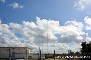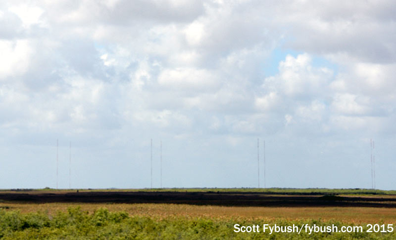 And then, 10 miles out from Krome past the alligator tours and souvenir stands, a nearly-unmarked turn leads out to the five towers of Lincoln Financial (now Entercom)’s sports station, WAXY (790 South Miami). Licensed at 5 kW day and night, WAXY has long been running 25 kW into this directional array under an STA aimed at overcoming Cuban interference.
