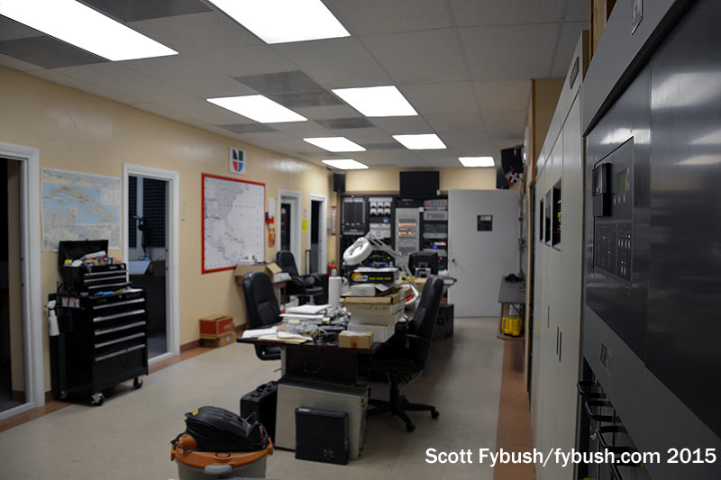 The other side of the room features a row of small emergency studios that could be used by each of Univision Radio’s Miami-market stations in the event their main studios closer to town become unusable. (And yes, that’s most definitely a Cuban flag above the phasor; this night signal blows south over Cuba and much of the Caribbean.)