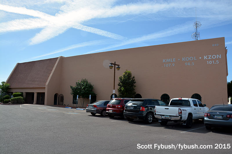 The consolidations of the 1990s brought KOOL-FM (94.5), KZON (101.5) and KMLE (107.9) into what was then the Chancellor Media family, joining KOY/KYOT here at 840 N. Central. When Chancellor merged in with Clear Channel, which already had stations in the market, KOOL, KZON and KMLE went to Infinity and thus to present-day CBS Radio, which is why the old “KOY Building” no longer has a KOY in it.