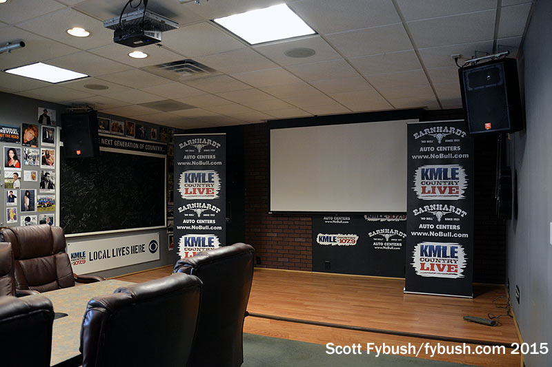 There are programming offices along the north side of the building, and behind them a very blue tiled hallway lined with studios that date back to the 1970s. KOOL-FM and a crowded rack room are on one side, across from the old KOY studios, now used by country KMLE and a production suite.