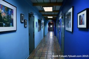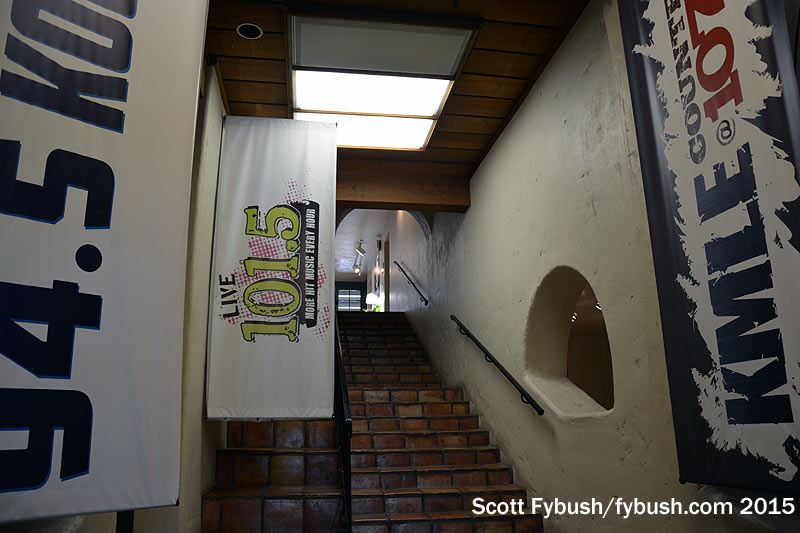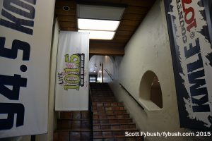 This is a neat building, with several generations of history accreted along its hallways. A 1970s renovation turned what had been an Art Deco building into Southwest adobe and tile. Walk into the lobby now (where there’s a nifty little workstation that allows visitors to record station IDs), and you’ll be facing a steep tiled stairway that leads up to management offices upstairs.