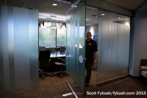 The new Bonneville plant is quite impressive, starting right at the lobby. Look to the right and a glass wall provides a view of the KTAR newsroom and sports studios; to the left, a frosted glass wall turns out to be partially a huge door on a center pivot leading into a conference room. (The wall and door were salvaged from a previous tenant in this space, because why let that go to waste?)
