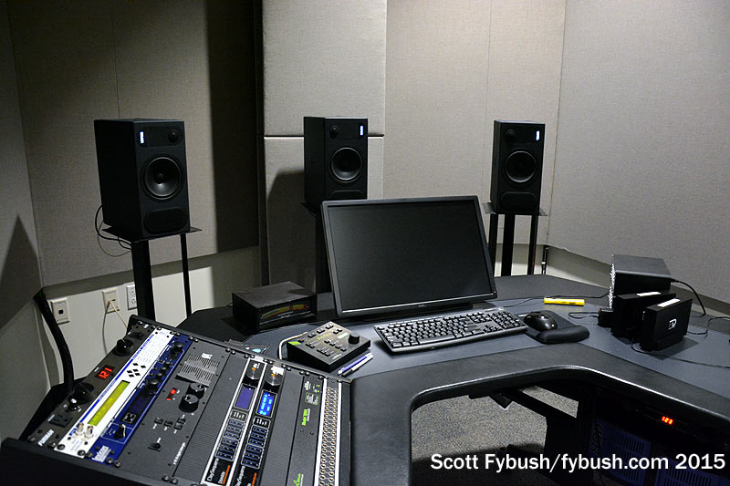 One floor down, there’s a nifty facility that serves multiple purposes: Central Sound @ Eight handles audio post-production on KAET’s broadcasts and also serves KBAQ (89.5), the classical station jointly operated by ASU and the local community college. That sweet sweetening suite shown above is a surround-sound post room where Alex Kosiorek and his Central Sound team mix down everything from symphony broadcasts to student productions.