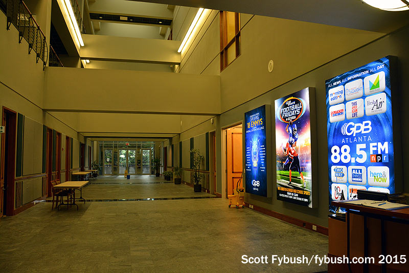 Inside, some of the lighted panels in the lobby advertise the new partnership that gave GPB Radio an Atlanta outlet for the first time. Somewhat controversially, GPB struck a deal with Atlanta State University to take over the daytime hours on WRAS (88.5), displacing student and community programming to an HD2 and stream.