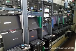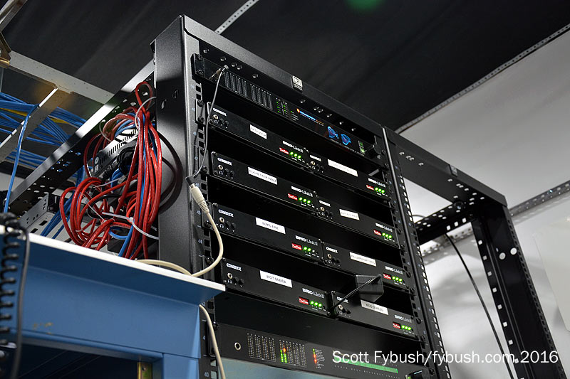 Down the hall, there’s a spacious production room that’s used for youth productions and radio drama – and in the other direction, the Family Life IT racks were being expanded when we visited, though we caught a glimpse of some of the IP networking that now sends FLN programming out to some of the full-power stations that carry the network on HD2 and HD3 subchannels. (A more extensive IP network will soon replace much of the satellite uplinking that carries Family Life to its owned signals across New York and Pennsylvania.)