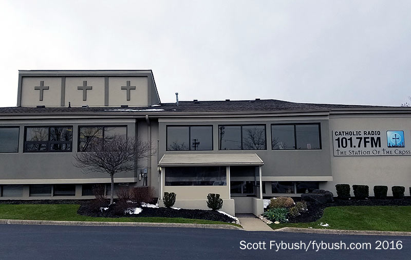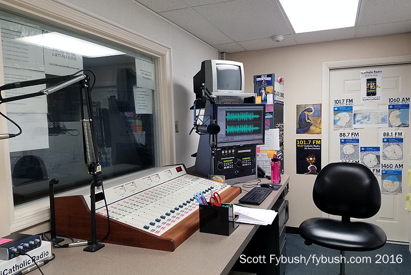 Holy Family Communications now broadcasts “The Station of the Cross” on signals that stretch from Boston (WQOM 1060 Natick) to northeastern Ohio (WMIH 89.5 Geneva), with stops along the way in Syracuse, Rochester (WHIC 1460) and Buffalo (WLOF 101.7 Elma), all coming from a talk studio and master control on the ground floor of this building, which also houses founder Jim Wright’s dental lab upstairs.