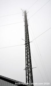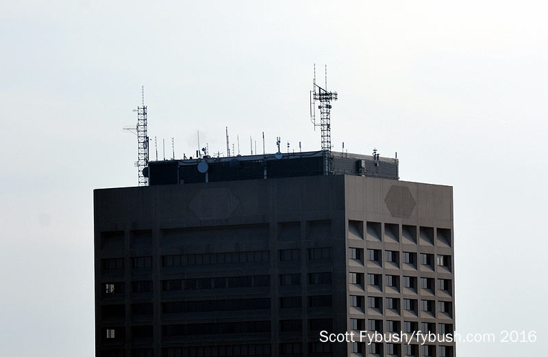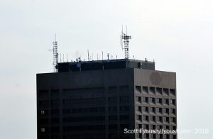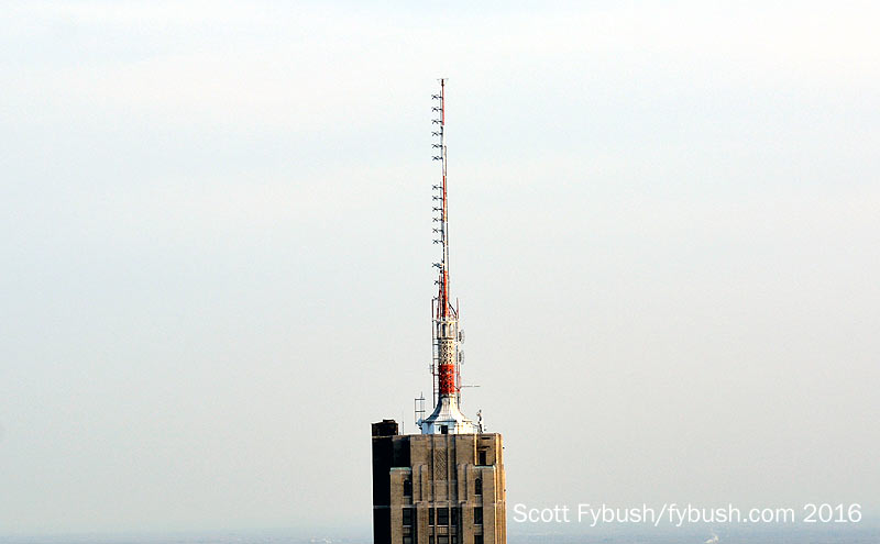 And we leave you with a few images from another day trip to Buffalo: on a clear day from the observation deck high atop Buffalo’s majestic Art Deco City Hall, radio fans can get nice views of several of the Queen City’s downtown transmitter sites. To the west off Lafayette Square, the Rand Building’s mast is home to Townsquare’s WBLK (93.7 Depew), WMSX (96.1 Buffalo) and WYRK (106.5 Buffalo); to the southwest, the former 1 HSBC Center building is now called “One Seneca Tower,” and a careful view of its roof shows the antennas on the left side for W227BW (93.3 Cheektowaga, another WZXV Calvary Chapel relay) and Dick Greene’s W275BB (102.9 Cheektowaga), relaying AC WECK (1230).
