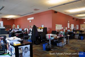 All that “extra” space upstairs? That’s WESA’s newsroom now, and our former Rochester colleague Deanna Garcia was settling into her new role as acting news director when we visited. There are several small voice/interview booths adjoining the newsroom, and lots of natural light from the big northward-facing windows looking out toward the river.