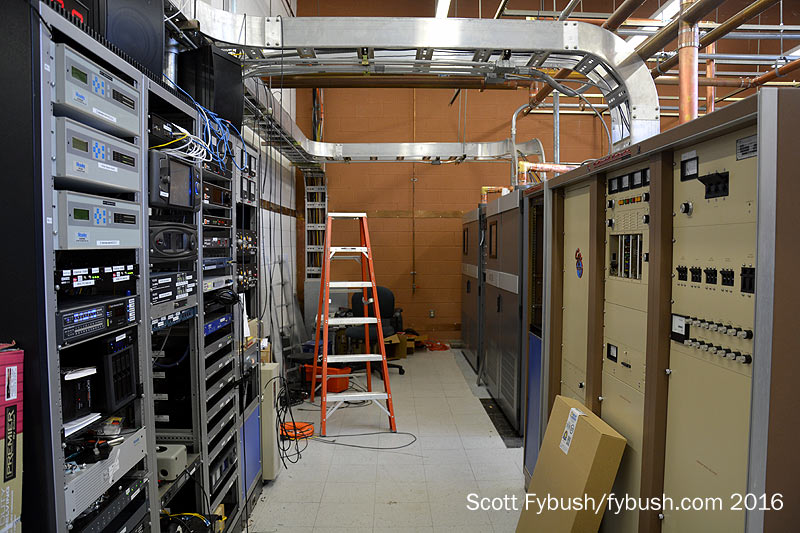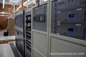 That building and the 1989-foot tower next to it replaced an earlier tall tower for WRAL-TV that came down in an ice storm in December 1989. But while channel 28 and WQDR are still on their side of the building, WRAL-TV isn’t using the left side of the building or the tower anymore. With the end of analog channel 5, this tower site on TV Tower Road now has only FM on the Capitol side. WRAL-FM has a pair of 30 kW Nautels combined to feed its panel antenna; WCMC-FM occupies the old TV side of the room with a single Nautel for its lower-powered signal.