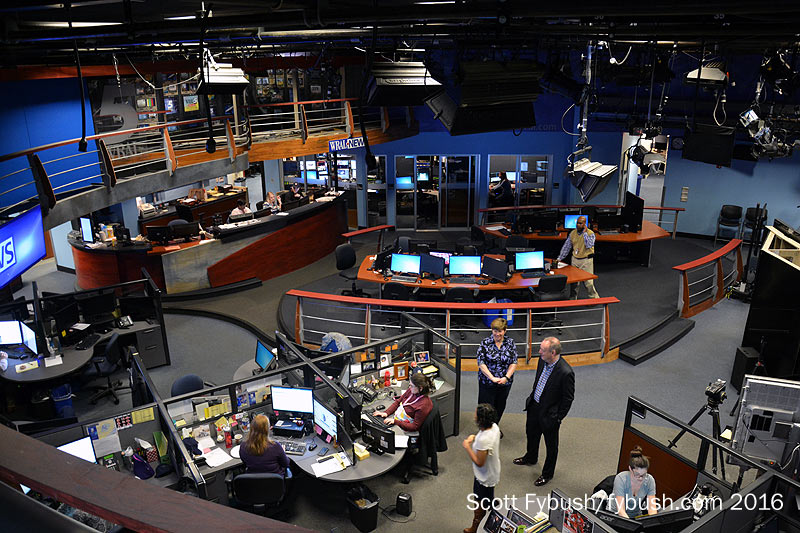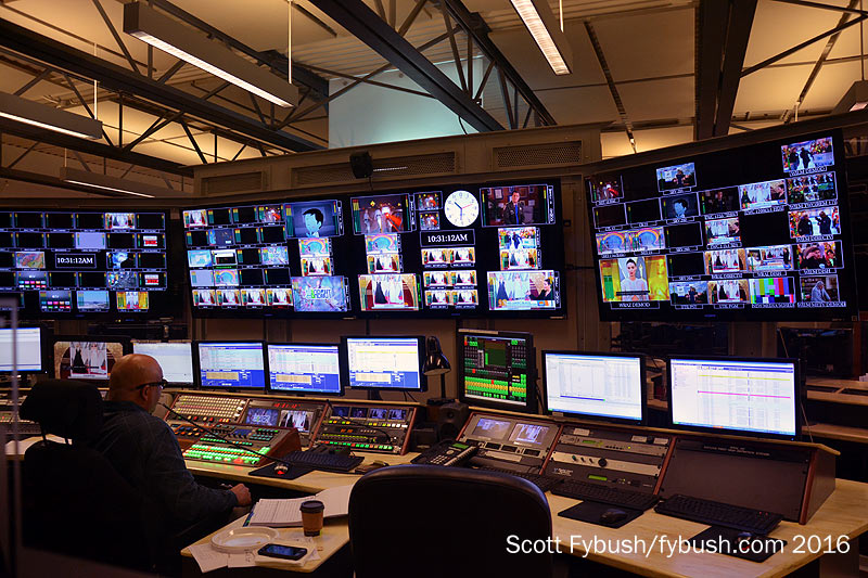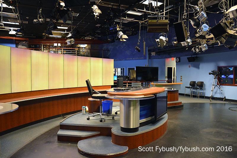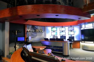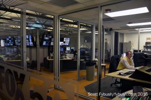 This huge facility spreads out over three floors, and we start toward the back, where the station’s management offices are on the ground floor down the slope of the hill. The current newsroom/studio is back here as well, occupying part of two stories of the building. WRAL does a lot of news out of here, with the usual news lineup on the now-NBC channel 5 plus 7-9 AM and 10-11 PM on Fox 50, all hugely dominant in the ratings.