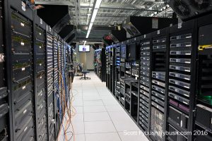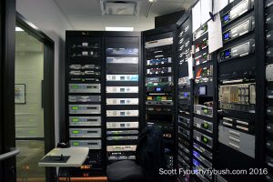 The master control area is one of the most recently rebuilt parts of the building. Capitol CEO Jim Goodmon was here just a few hours ahead of our visit, pressing the button to put NBC programming on the air at 7 AM. CBS is actually still running through this room; back around the corner from the WRAL-TV master control is the MCR for sister station WILM-LD (Channel 10) in Wilmington, 90 miles to the southeast, which is keeping CBS. (WILM has its own local weather but otherwise simulcasts WRAL-TV’s newscasts.)
