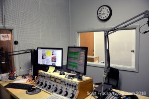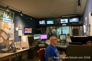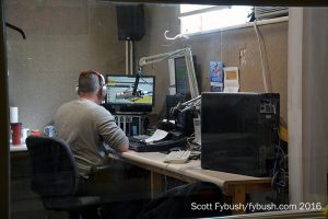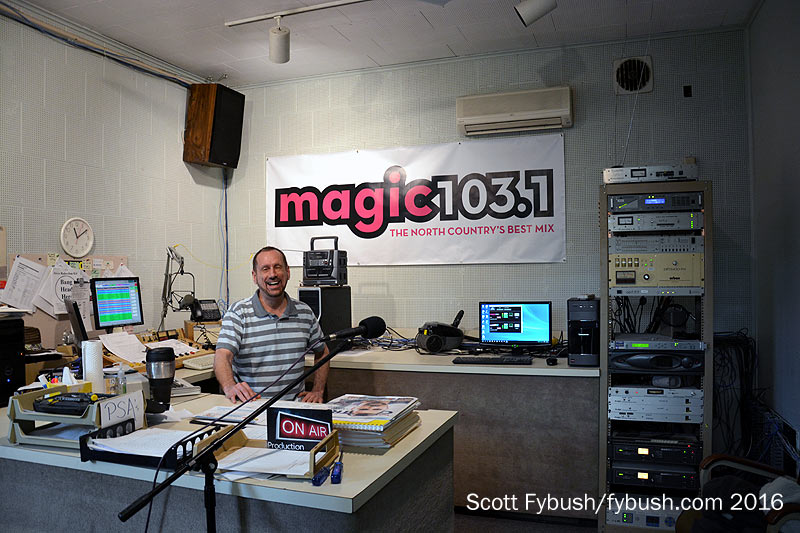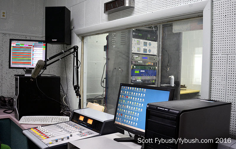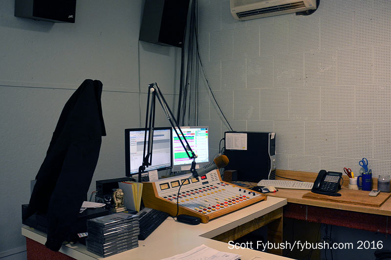 If you’re standing at the WATN board facing the new window, to your right is a small studio that’s home to WEFX (100.7 Henderson), mostly automated with “Eagle Country,” as well the local automation for WLYK (102.7 Cape Vincent), the US-licensed station that’s LMA’d out to Rogers over in Kingston, Ontario. (WLYK doesn’t belong to Community Broadcasters; it’s licensed to Border International Broadcasting, which is majority owned by John Clancy and David Mance, whose Clancy-Mance group sold the rest of this cluster to Community a few years back.)