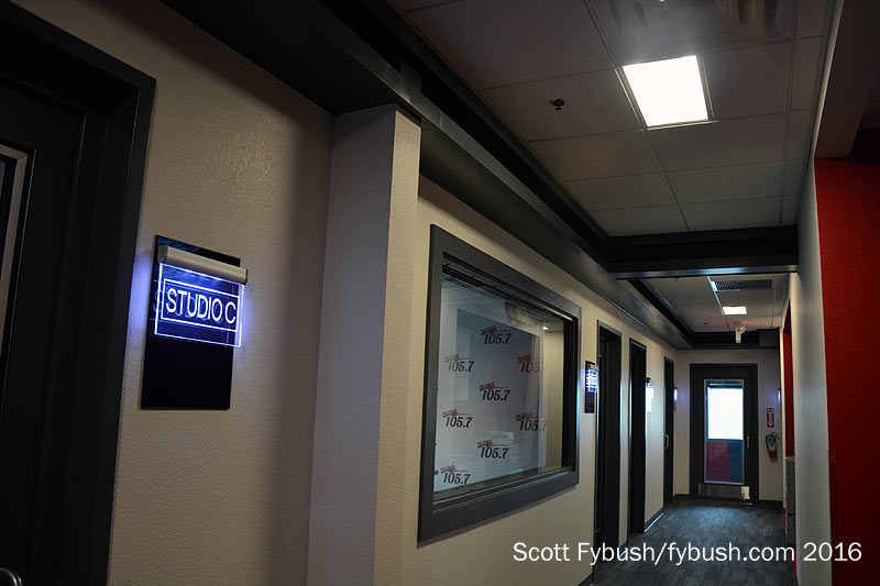 There’s a conference room/performance studio up here for (again) those visiting artists, anchoring one end of the “U.” Classic rocker KKLZ (96.3) holds down a corner, with classic R&B KOAS (105.7) midway down the hallway and country KCYE (102.7) at the other corner.