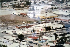 The new building went up in three parts: a studio pod at the center, with offices for KABC and KLOS curving off on either side. When it was done, the old building was torn down, creating some open space fronting La Cienega and eventually a big curving parking lot under the AM towers.