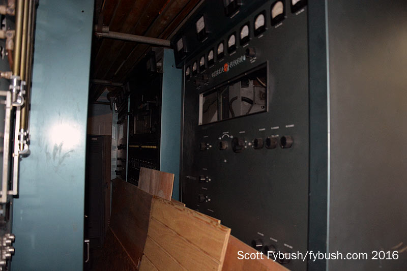 Our first stops for the day were all up on Smith Hill, the Utica TV/FM tower farm that we’ve profiled here several times in the past. This time, we started our tours at the top of the hill at the studio/transmitter building for Nexstar’s WUTR (Channel 20) and WFXV (Channel 33), where there had been plenty of changes in recent years. There’s a restarted news operation with a new set in the old WUTR studio and a new newsroom and control room in part of what had been the old analog WUTR transmitter room. (The digital transmitters for WUTR and WFXV are down the hall now in a newer transmitter space back by the tower.)