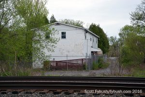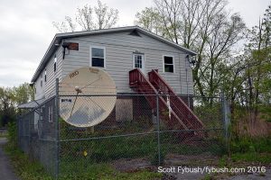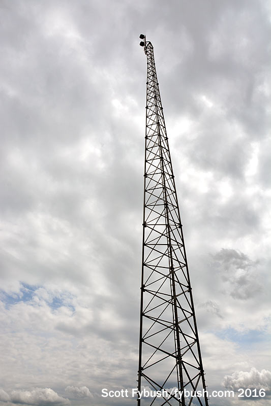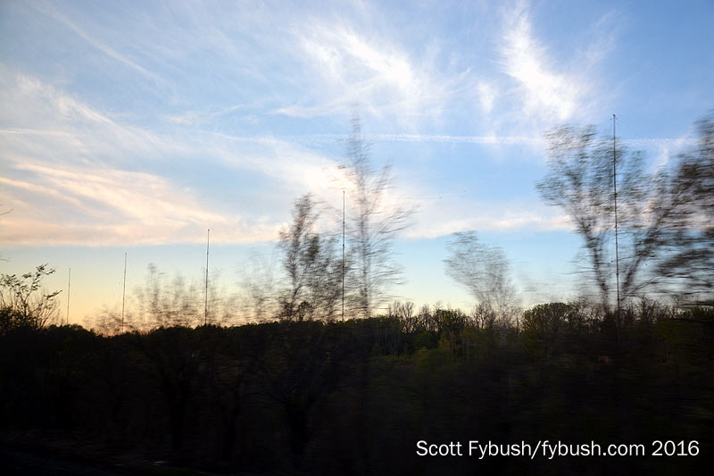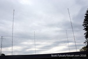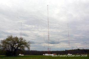 With a few hours yet to spare before our train is due to get us back to Rochester, it’s off to see what’s left of Utica’s AM dial…and it’s a little depressing, to be honest. We start south of Utica in Washington Mills at WTLB (1310), which was the big top-40 station here through much of the 1960s and 1970s. Galaxy Communications recently moved out of the studio/transmitter building here and into a new downtown Utica streetside studio – and it’s had a longstanding CP to take down three of these four AM towers, dropping from 5 kW day/500 watts night to 2.6 kW day and just 40 watts at night.