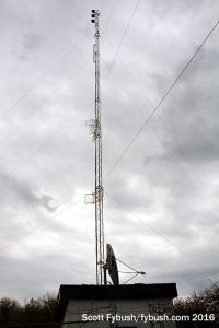 From here, we head west and a little south, crossing the Thruway and the Mohawk River and then back up into the hills south of the river to the Higby Road site of Utica’s 100.7, which is now Roser’s AC WUTQ-FM but has been through two decades of earlier incarnations as local religious broadcaster WVVC and then EMF’s WKVU. The tower sits up on a hill above the studios for WVVC, which lives on as an LPTV station and as the lower-powered 88.1 FM that we saw at the WKTV site.