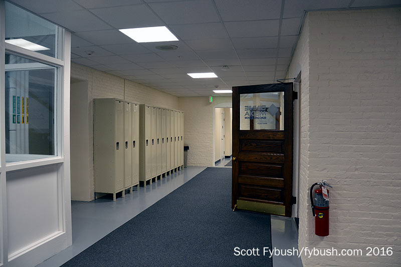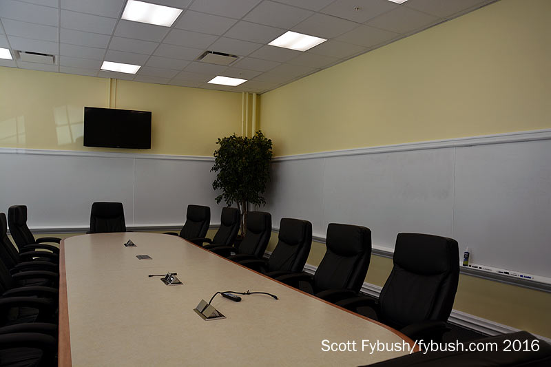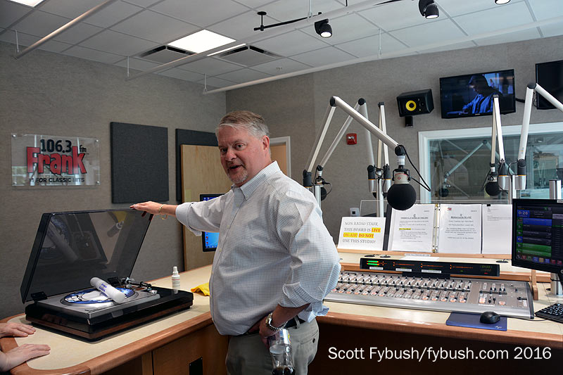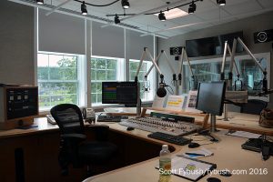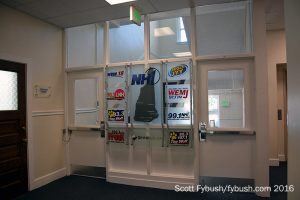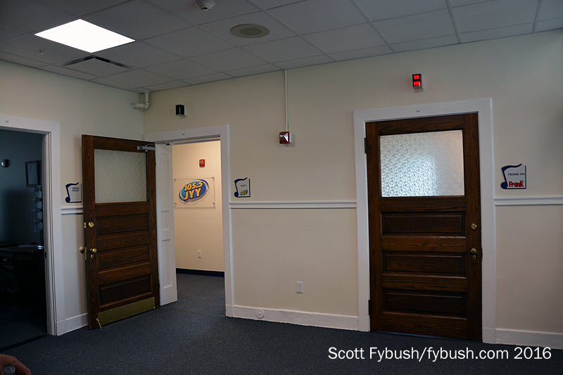 The other corners of the second floor all belong to radio – behind the old classroom doors, there are suites of production room/air studio pairs for each of the radio stations that come out of here. Top 40 WJYY (105.5) is licensed right here in Concord, while classic hits WFNQ (106.3) is licensed down in Nashua (check out the turntable!)