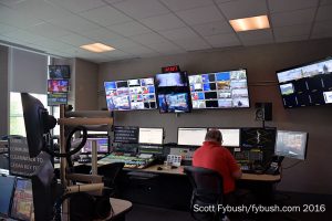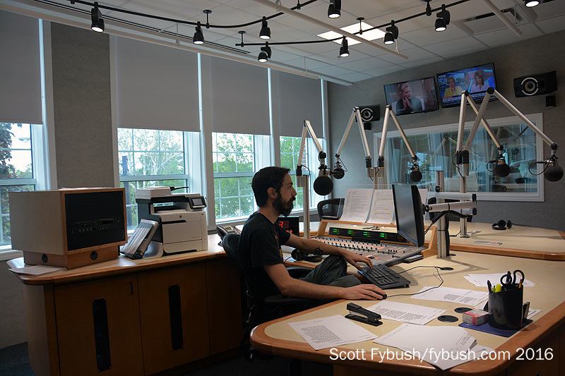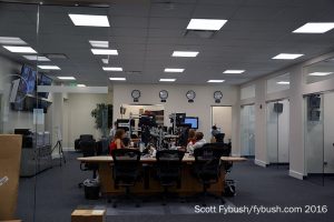 A U-shaped collar of studios and control rooms along both sides and the back of the second floor surrounds the big auditorium-turned-TV studio. In one corner is the TV control room and adjoining audio booth; from here, the NH1 newscasts are sent down to the WBIN-TV facility in Londonderry that still houses the TV station’s master control functions.