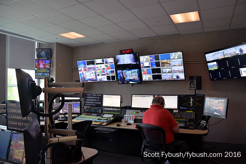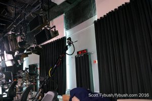 The Binnie studio space is upstairs, anchored by the former auditorium that once filled the front center of the second floor. The big windows have been curtained over, and the stage has been replaced by the big video walls of the NH1 News set.