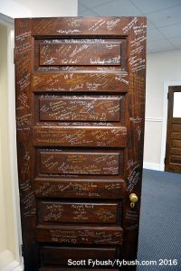 To the left of the lobby, a row of former classrooms has been carefully preserved, transformed into conference rooms – and even one of the classroom doors remains, with signatures from former Walker School teachers and alumni adorning the inside of a coat closet.