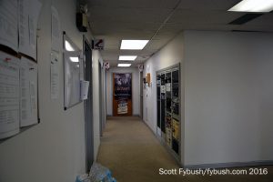 The executive offices are on the upper floor of this two-story office building, with studios laid out in a neat line downstairs, starting with the top-40 WXIL “My 95” studio.