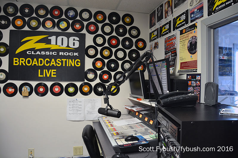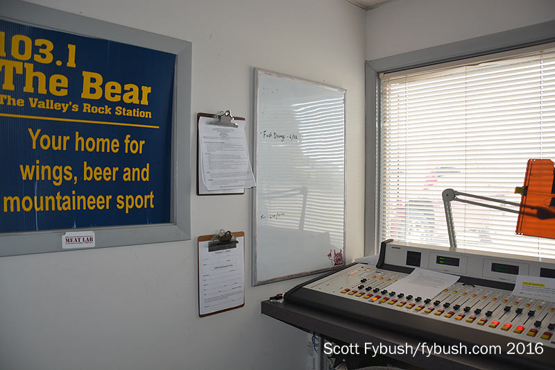 Continuing down the hall brings us to rocker WHBR (103.1 the Bear), the mostly-automated talker WVNT (1340) and standards WADC (1050), classic rock “Z106” WRZZ and the other big FM here, country WGGE (Froggy 99.1), which has its transmitter on the Ohio side of the river west of town.