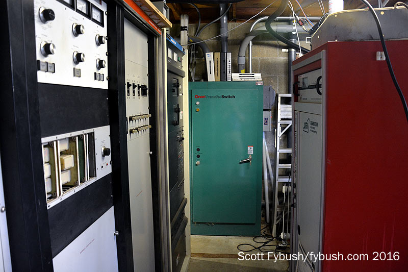 “Got time to see more?,” Tom asked us – and of course we did, so we headed off east of Parkersburg on US 50 to the tower site of Burbach Broadcasting’s WXIL (95.1 Elizabeth), WHBR (103.1 Parkersburg) and WRZZ (106.1 Parkersburg). These three signals are tightly packed into a block building up a steep driveway; if I recall right, that’s WXIL on the old Collins at left, WHBR on the Harris next to it and WRZZ on the QEI on the right.