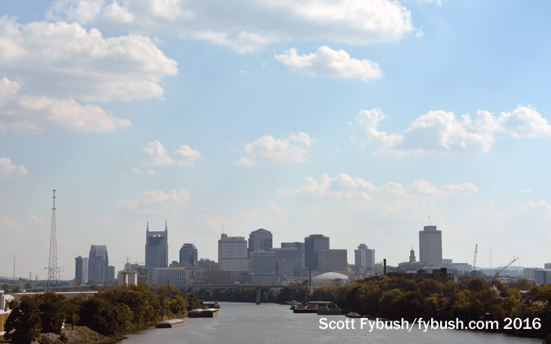 Headed back downtown, we get a lovely view of the Nashville skyline overlooking the Cumberland River as we head back into town. (If we could see through downtown, we could see the other TV/FM farm south of downtown; that site, down near Brentwood, is home to ABC affiliate WKRN channel 2, PBS outlet WNPT channel 8, plus several more FMs.)