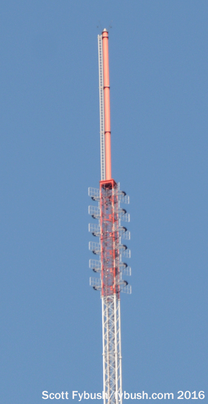 And we can look across I-24 to see the tower of CBS affiliate WTVF (Channel 5), which has an interesting pair of transmitter facilities here: its main signal is now on RF 25, but after initially being assigned back to low-band VHF, it kept a fill-in translator here on RF 4, using a six-bay antenna below the UHF antenna up top.