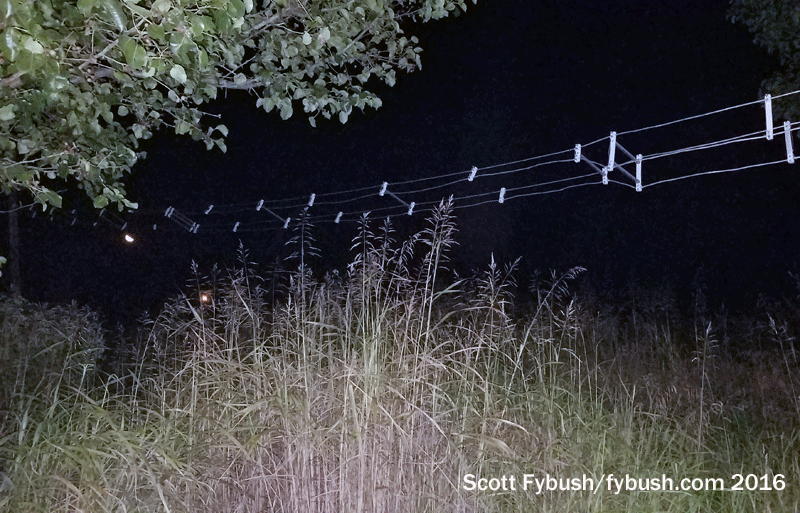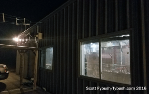 We’ll have to get back here in daylight at some point to show you the antennas in daylight; at night, all we can see is the feedline as it heads out into the fields around the transmitter building.