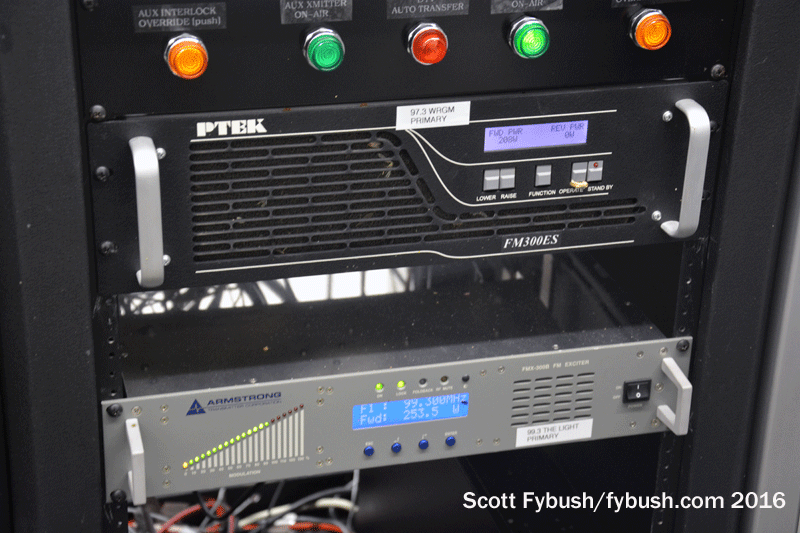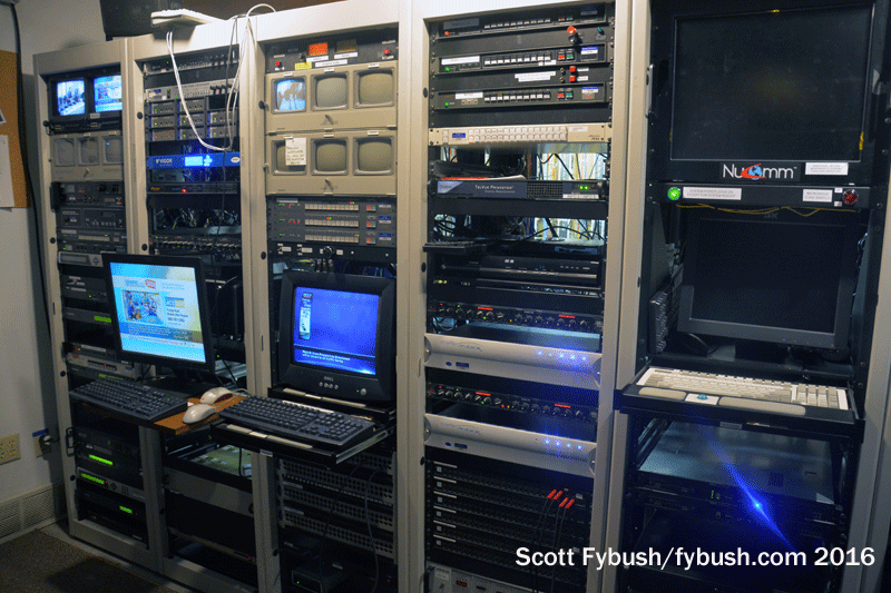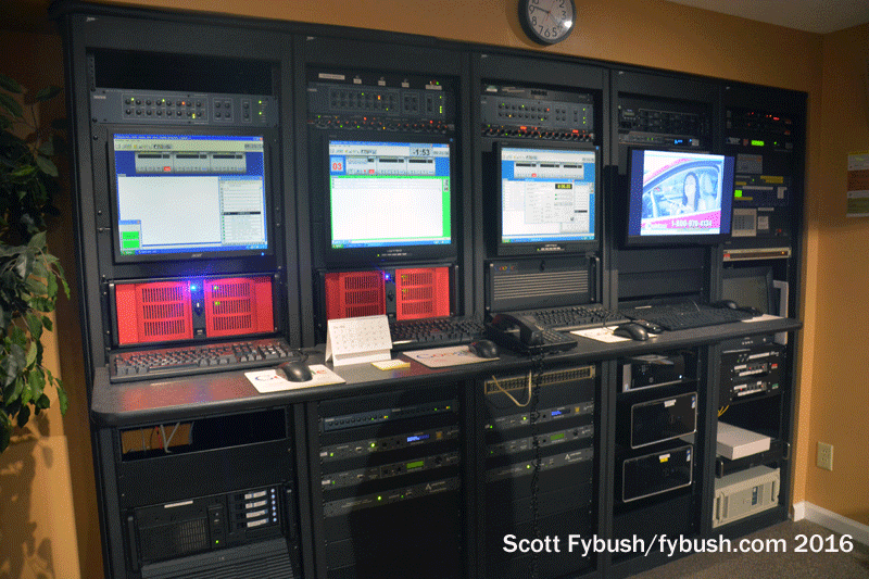 There are now four signals coming from the radio operation here: WVNO does AC as “Mix 106,” WRGM does sports both on AM 1440 and a recent FM translator at 97.3, and WVNO’s HD2 channel feeds contemporary Christian music to another translator at 99.3 as “The Light.” (Their automation systems are all lined up neatly in racks at the back of the studio complex.)