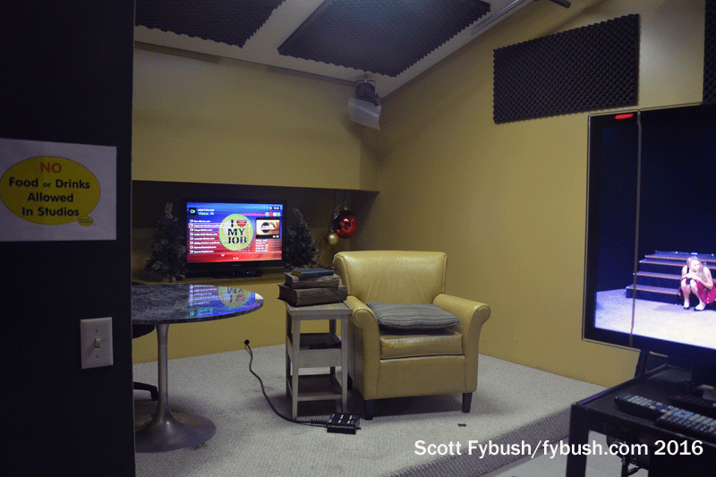 Working our way toward the rear of the facility brings us to the old WVNO fallout shelter, now repurposed as a production room – and then around the corner to the newer part of the building that houses the Meisse family’s TV operation, WMFD-TV and WOHZ-LP.