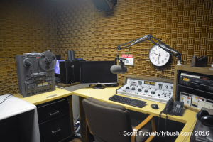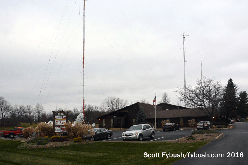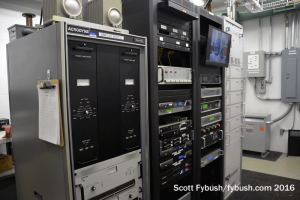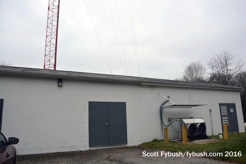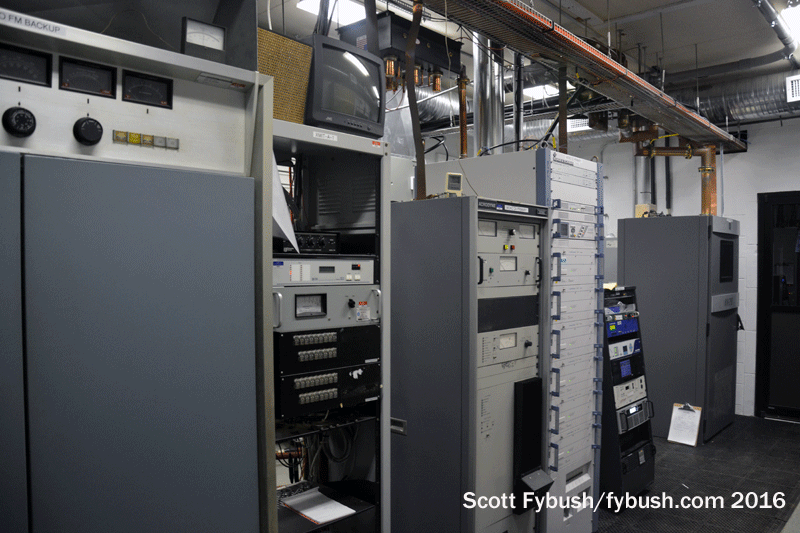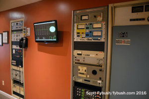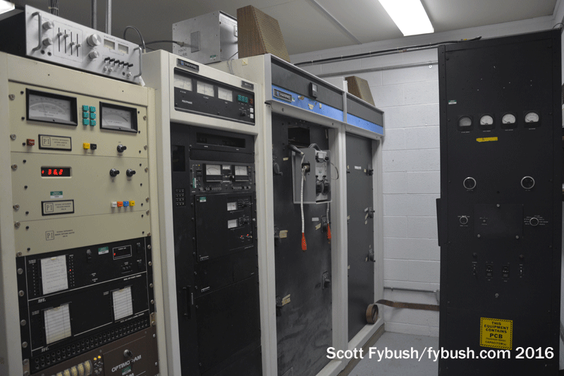 The stations have never moved in all these years, though the facility has certainly grown. When we stopped by in December 2016, it was hard to pick out the original 1962 facility amidst all the additions and renovations over the years, but it’s still there underneath, mainly on the right side of the current facility as seen from 309. Walk into the radio part of the building today and you’ll find yourself in a hallway with studios on one side and WVNO’s vintage RCA transmitter amidst some racks on the other side.