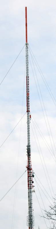 From left to right below, we’re looking at: the 350 Cedar Street tower over in Needham, capped by that pair of master antennas that carries WGBH, WGBX, WBZ-TV, WCVB and WSBK (and which has been plagued by failures over the years); lower down we can see the WGBH aux antenna and WKLB-FM (102.5), which was just about to be joined by a new WBUR (90.9) panel antenna. (This is also where NBC had recently installed its new antenna for its new “NBC Boston,” WBTS-LD, RF 46/virtual 8.) In the center is the “FM 128” tower on Chestnut Street in Newton, whose tenants now include several smaller DTV stations – and on the right is the candelabra on Cabot Street in Needham, where WFXT and WLVI are on the air up top, with a new CBS Radio auxiliary master antenna down below.