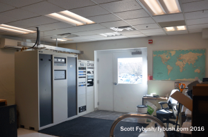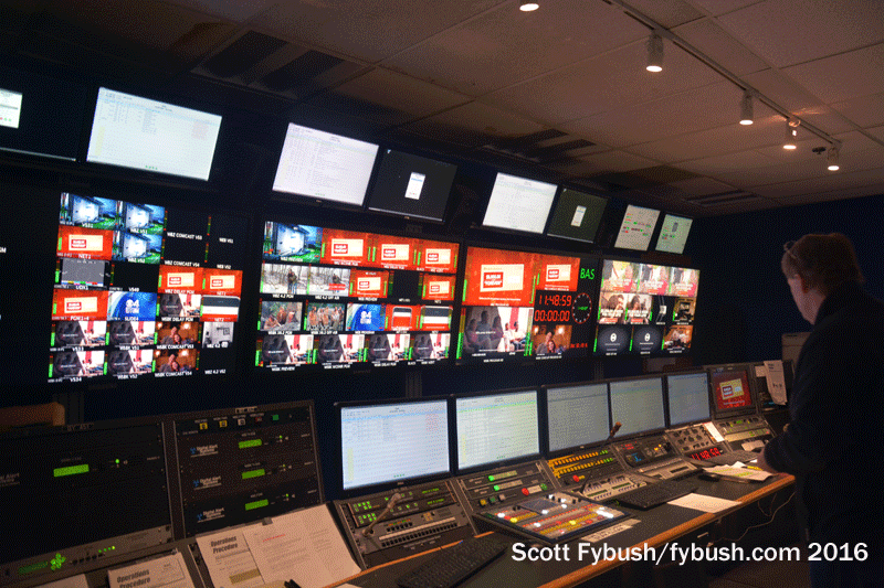 Walking down the big atrium from the lobby, we got some updated views of the control room on the left side that serves as master control for WBZ-TV (Channel 4) and its now-MyNetwork sister, WSBK (Channel 38). On the right side of the atrium, the TV control room we remember from the 1996 renovation has been supplanted by a new control room across the hall, more suited to today’s heavily-automated HD production.